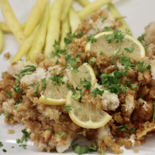 I have a simple dinner for you today my Galley Peeps. Delicate white fish, some salad crab and buttery crackers crumbs, cooked to perfection in barely 20 minutes.